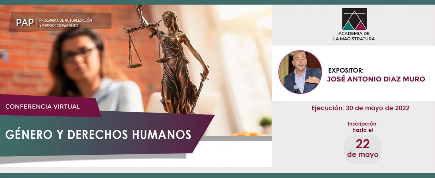 La Academia de la Magistratura tiene el agrado de invitar a los señores magistrados, auxiliares jurisdiccionales y asistentes de función fiscal del Poder Judicial y del Ministerio Público a participar en la Conferencia Virtual: “Genero y Derechos Humanos”, a cargo del expositor JOSÉ ANTONIO DÍAZ MURO, la misma que se llevará a cabo el día 30 de mayo del año en curso.