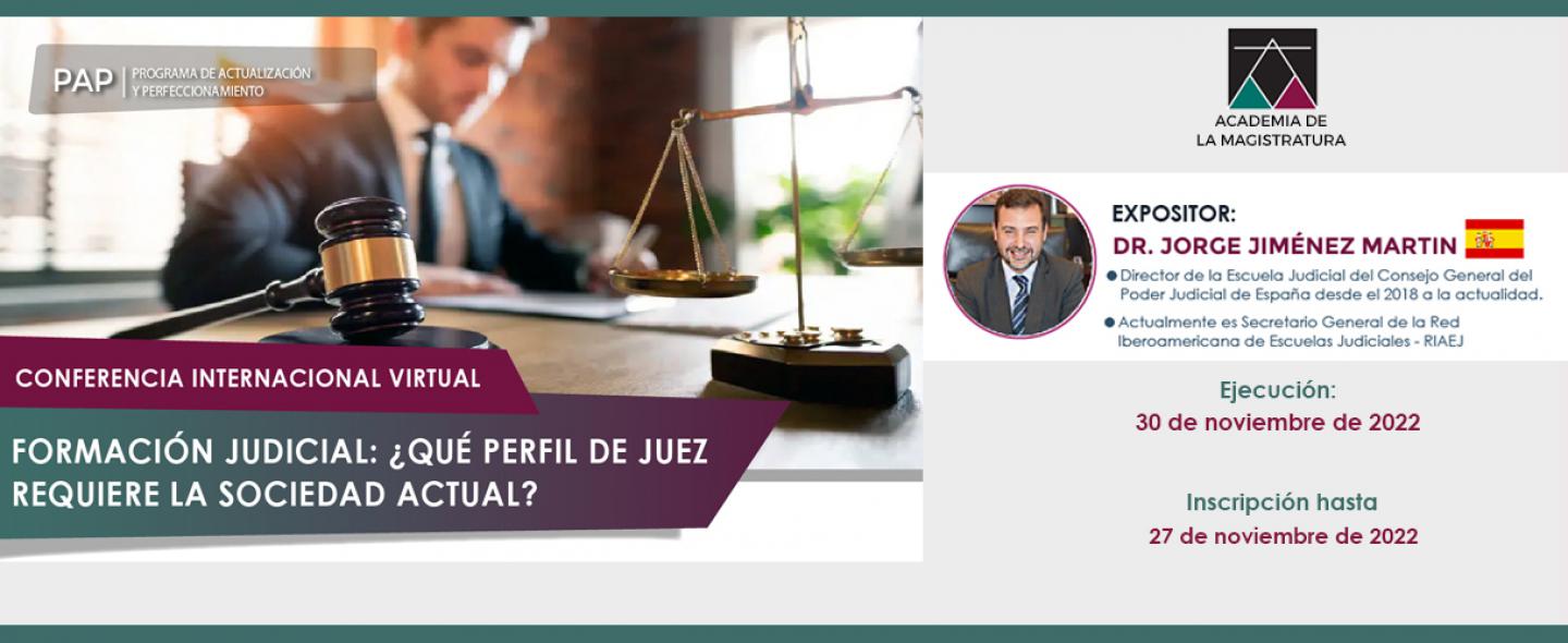 La Academia de la Magistratura tiene el agrado de invitar a los señores jueces, fiscales, auxiliares jurisdiccionales y asistentes de función fiscal del Poder Judicial y del Ministerio Público del Perú y a los magistrados de las Escuelas Judiciales que forman parte de la Red Iberoamericana de Escuelas Judiciales a participar en la Conferencia Internacional Virtual “Formación judicial: ¿Qué perfil de juez requiere la sociedad actual?”, a cargo del expositor Dr. Jorge Jiménez Martin (España), la misma que se llevará a cabo el día miércoles 30 de noviembre del año en curso.
