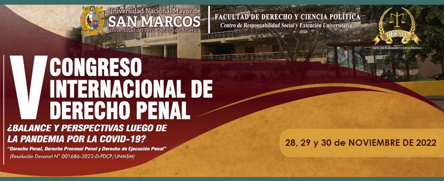 La Facultad de Derecho y Ciencia Política de la Universidad Nacional Mayor de San Marcos, realizará del 28 al 30 noviembre 2022, el V CONGRESO INTERNACIONAL DE DERECHO PENAL: ¿Balance y perspectivas luego de la pandemia por la COVID-19?, que contará con la participación de destacados expositores nacionales y extranjeros, evento que se desarrollará de manera presencial en el Salón de Grados “José León Barandiarán”.