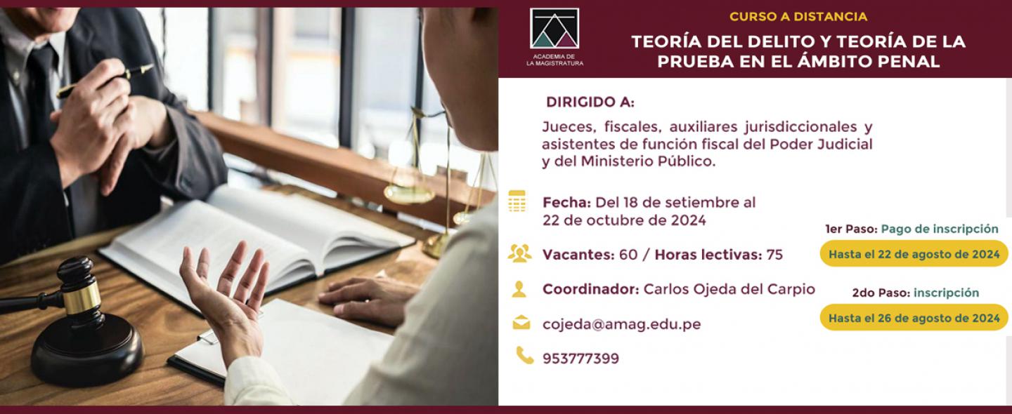 La Academia de la Magistratura convoca a los señores jueces, fiscales, auxiliares jurisdiccionales y asistentes de función fiscal del Poder Judicial y del Ministerio Público, respectivamente, a nivel nacional, a participar en el Curso a distancia “Teoría del delito y teoría de la prueba en el ámbito penal”.