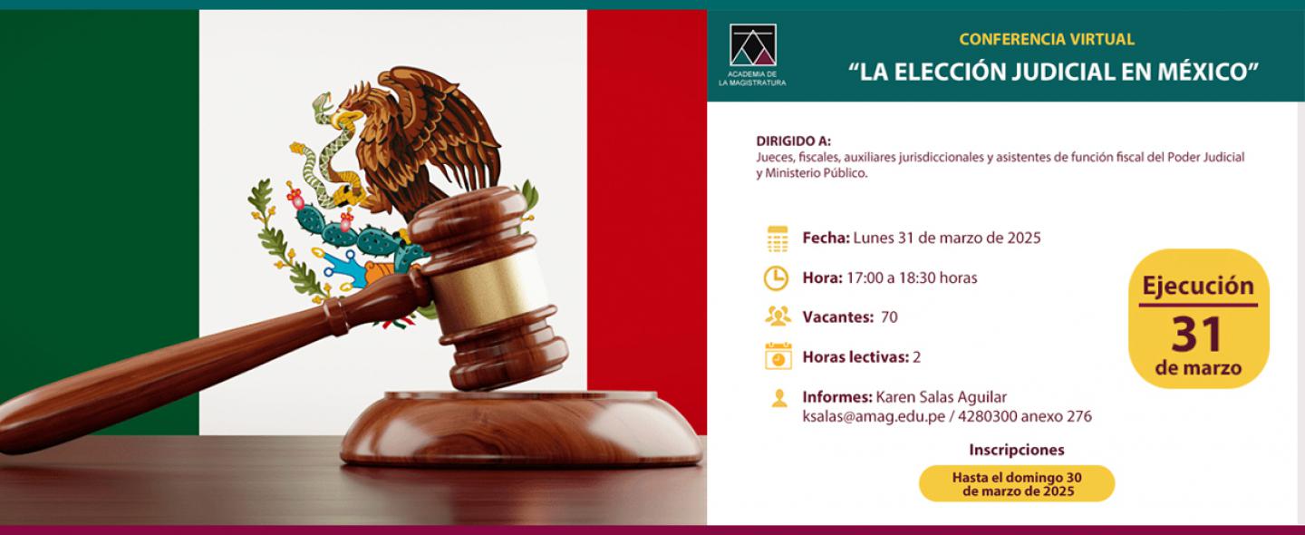 La Academia de la Magistratura y la Escuela Judicial Electoral del Tribunal Electoral del Poder Judicial de la Federación de México, tienen el agrado de invitar a los señores jueces, fiscales, auxiliares jurisdiccionales y asistentes de función fiscal del Poder Judicial y del Ministerio Público, respectivamente, a participar en la Conferencia virtual “La elección judicial en México”, a cargo del docente Felipe de la Mata Pizaña, la misma que se llevará acabo el día lunes 31 de marzo de 2025.